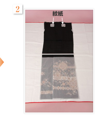 模様の刺繍や箔が擦れるのを防ぐため、上前のおく身(立褄)に柄あて用雲竜紙をあてます。